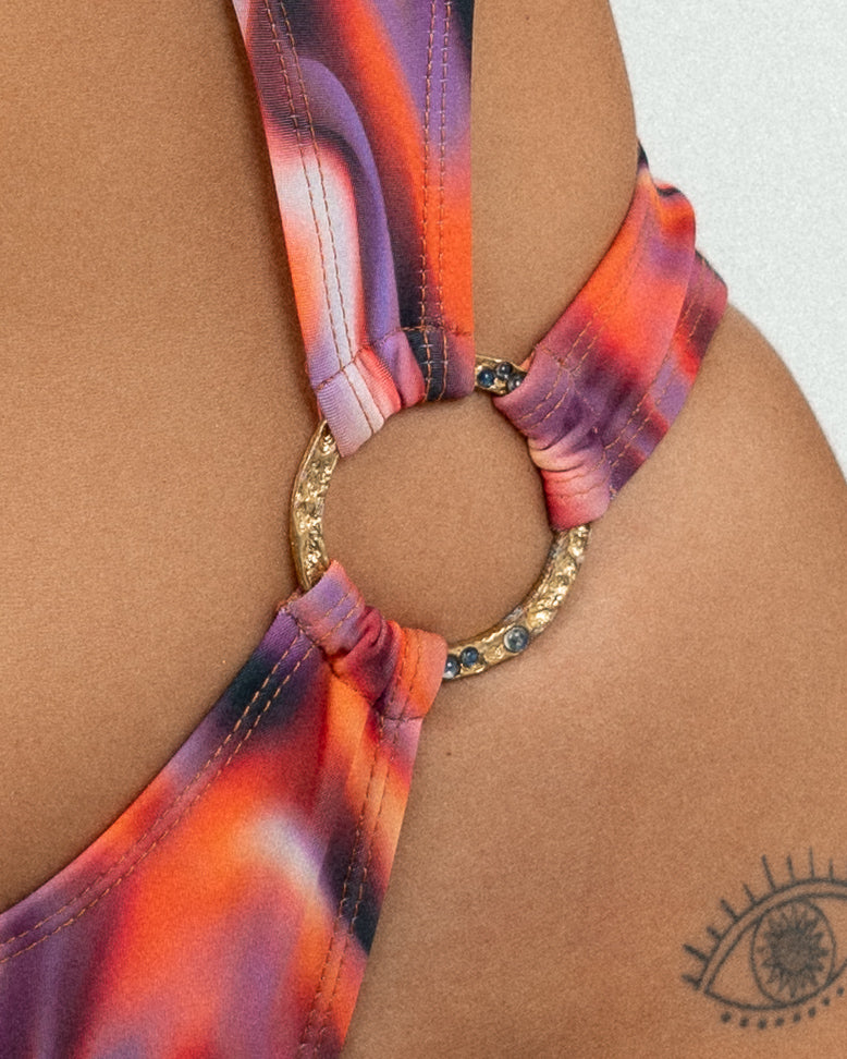 This perfectly asymmetrical design is form fitting with our soft and stretchy recycled fabric in a unique custom designed print, “Inferno” created to ignite the fire and confidence within you. This one-piece fits comfortably in all the right places, supporting you while looking chic and sexy.